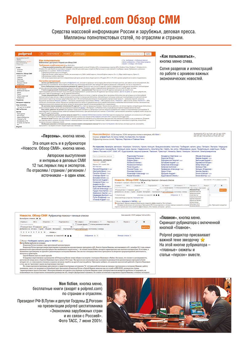 На кнопке Анонс/баннер/афиша polpred меню слева есть объявления для отраслевых библиотек, а также на англ. и др. языках. Там же — краткие аннотации базы данных Polpred.com Обзор СМИ. Установите на Рабочем столе иконку с «Полпредом» для быстрого доступа к сайту.