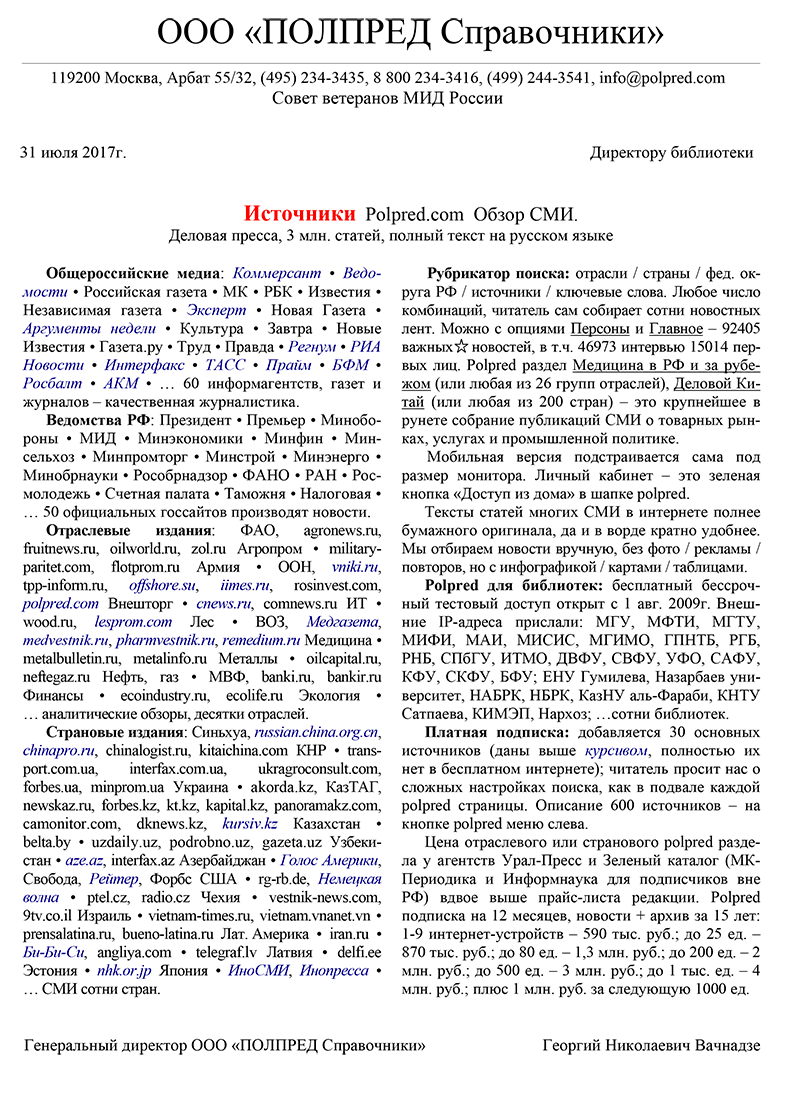 Polpred.com Обзор СМИ. Новости информагентств. Рубрикатор ЭБС: 26 Отраслей и 1270 Подотраслей / Россия и 8 Федеральных округов / 89 Субъектов РФ и 1760 Городов / 230 Стран и 1150 Провинций / Технологии 2550 Вузов мира / 600 Источников / 4 млн статей за 25 лет / Полный текст на русском / 240000 материалов в Главном, в т.ч. 130000 статей и интервью 35000 Персон / Важное / Упоминания / Избранное / Поиск sphinxsearch. Личный кабинет. Доступ из дома. Мобильная версия. Машинный перевод. Интернет-сервисы. Оригинал статьи. Без рекламы. Тысячи рубрик. Тест полдоступа. Платная подписка.