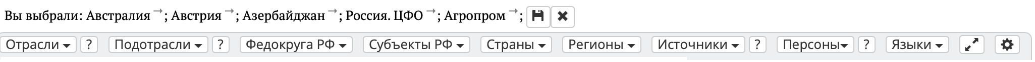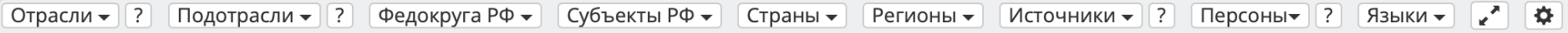 Первая строка состоит из основных параметров, по которым отбираются новости. Прежде всего это «Отрасли» и «Страны», которые мы привязываем к каждой новости в базе. Вы можете выбрать одну, две и более Стран или Регионов из 250, а также Отрасли экономики по тематике новости. У части Отраслей есть также Подотрасли. Читатель может указать, на каком языке хочет получить подборку новостей; если выбран английский, отображаются только англоязычные источники, а если русский — англоязычные источники исключаются из подборки. Оставив в рубрикаторе опцию «Языки», смотрим всю информацию, а не отдельно на русском или на английском.