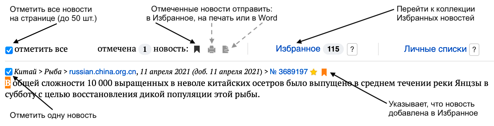 Работа с массивом информации может вестись при помощи рубрикатора и его дополнений: личные списки; избранные новости.
